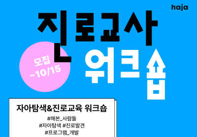 [모집] 하자센터 진로교사 워크숍 참가자 모집(~10/15)청소년 '진로'에 대해 항상 치열하게 고민하고 계실 현장의 선생님들을 위해 하자센터에서 준비한 두 가지 워크숍을 소개합니다. 중/고등학교 진로교사 ...